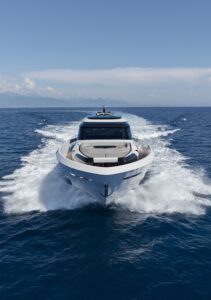 This new model is packed with details designed to enhance the onboard experience, both during high-speed navigation and in more intimate moments at anchor. On the main deck, bold personality meets a welcoming environment for socializing: the aft cockpit features a spacious sunbathing area with sofas and lightweight furniture, while the bar unit, serving both interior and exterior areas, creates a continuous functional and visual flow.